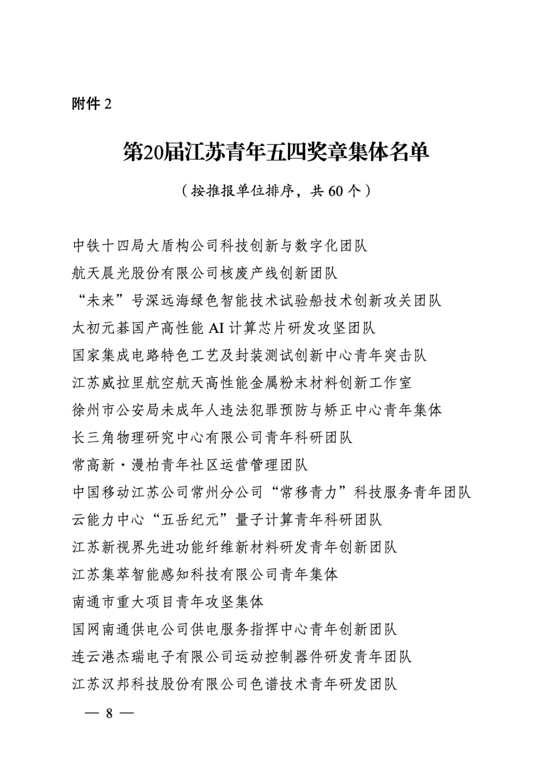 共青团江苏省委、江苏省人力资源和社会保障厅决定,授予丁蓉蓉等60名同志第20届“江苏青年五四奖章”,授予国家集成电路特色工艺及封装测试创新中心青年突击队等60个青年集体第20届“江苏青年五四奖章集体”。