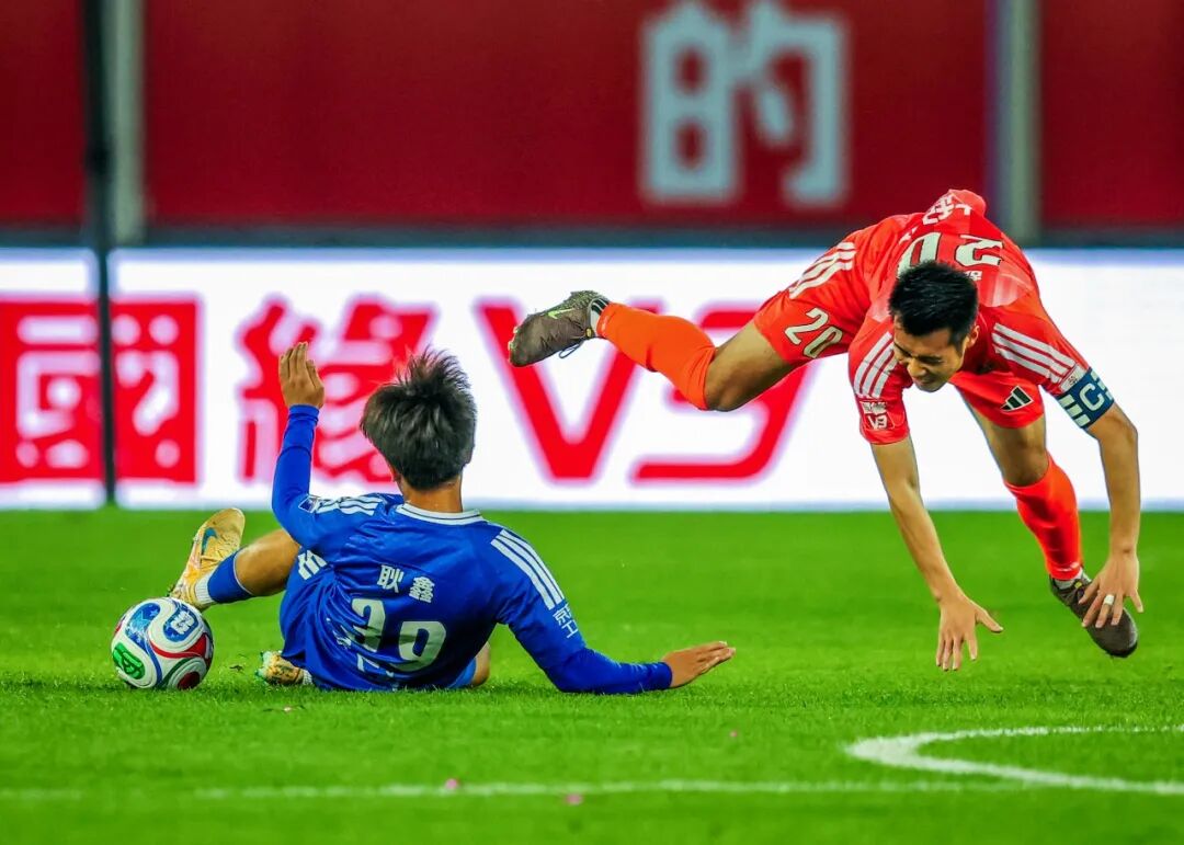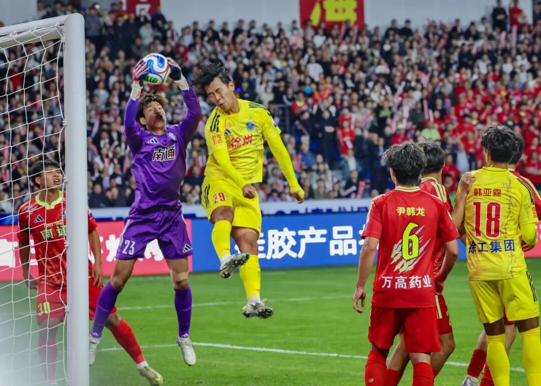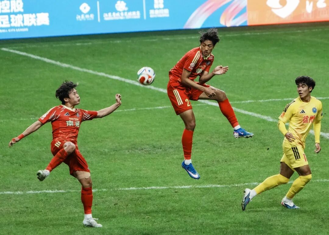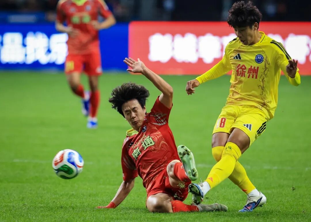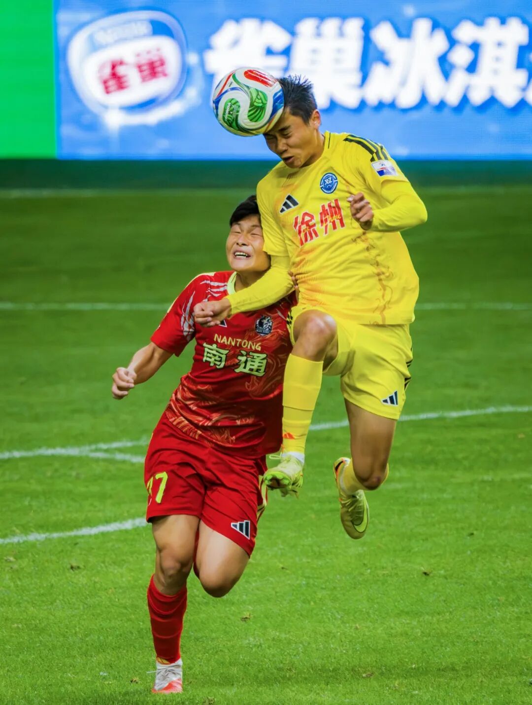 南通队球员(红色球衣)与徐州队球员(黄色球衣)在比赛中拼抢。徐培钦 摄