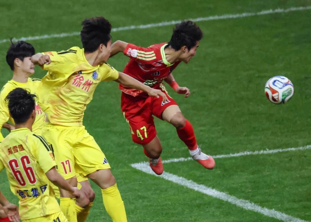 连云港队4号球员顶球瞬间。吴雨敏 摄