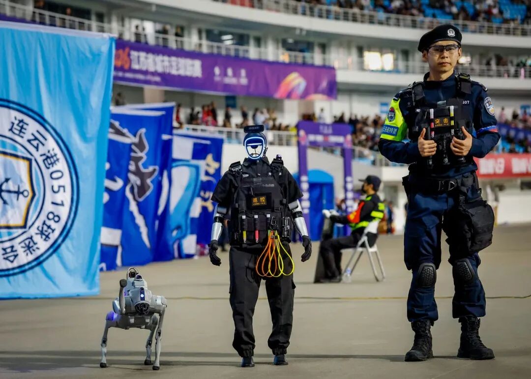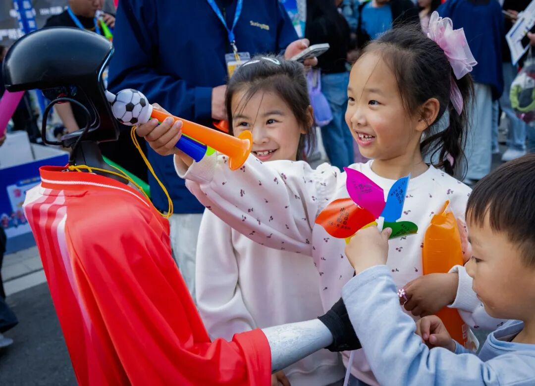 2026年4月25日,盐城奥体中心场馆外,孩子们和机器人开心互动。李东风 摄