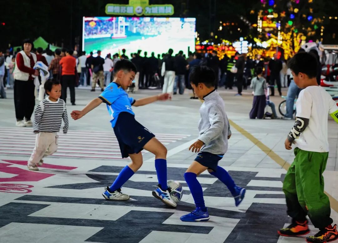 2026年4月25日,夜幕下的徐州云龙区星悦城广场,大屏转播着“苏超”的激烈战况,广场上一群小球员正演绎着最动人的“未来之战”。高刚 摄