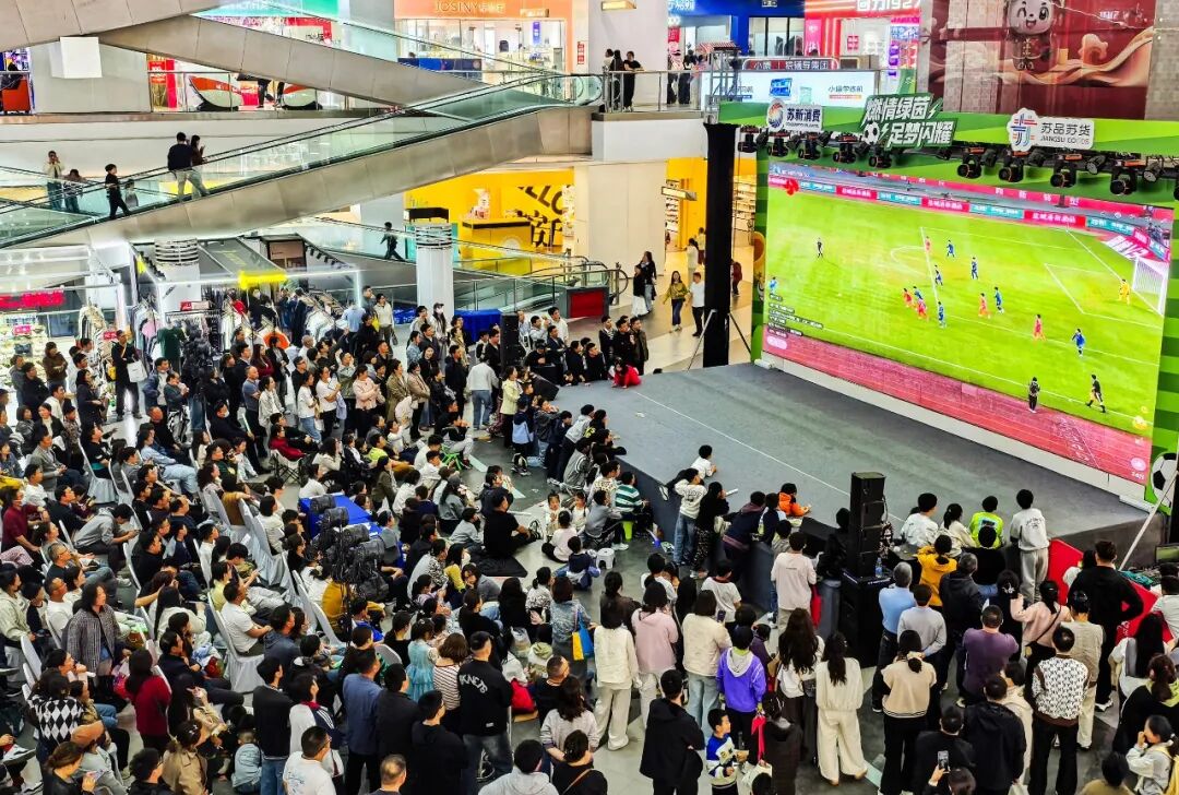 2026年4月25日,市民在宿迁宝龙广场中庭观看“苏超”第二现场宿迁队与盐城队比赛。沈红荣 摄
