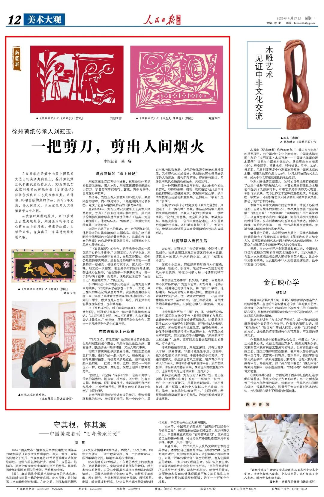 在日前举办的第十七届中国民间文艺山花奖颁奖典礼上,徐州剪纸第三代非遗代表性传承人、90后剪纸艺术家刘冠玉的剪纸作品《日常纸记》获得优秀民间工艺美术作品奖。这件由100幅剪纸构成的作品,历时2年完成,将人间烟火、乡土记忆与人文情愫融于方寸之间。