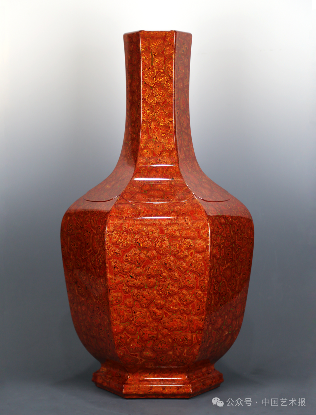 【甘而可谈创作】犀皮漆是传承至今的多种漆器技法中非常罕见的一种,也是我从事漆器工艺创作以来最为人所熟知的专长之一。犀皮漆这一漆器类别的特点,是要在完成漆灰的胎骨上打埝,层层髹涂色漆,干后经打磨抛光显露出美丽纹理。《六合承平》便是一件犀皮漆作品,此瓶按古法技艺纯手工制作,披麻上灰,以银朱、朱砂、黄金等细粉末入漆,作品表面犀皮漆流光溢彩,纹理如行云流水,天然灵动,神采飞扬,充满梦幻般的感觉。灿烂的金、红二色如烈焰升腾,充满生命活力;色彩如织锦般华美,雍容华贵,仪态万方。这件作品历时两年完成,我想此作品能展现当代民间文艺家一丝不苟、精益求精的作艺态度,以及创新创造的时代精神。