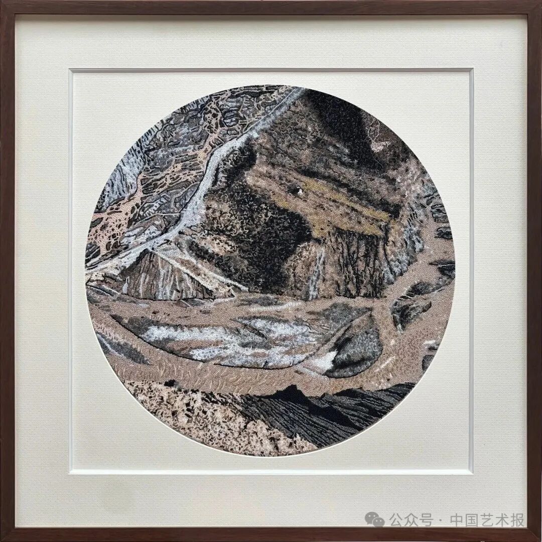 【作品介绍】《峡谷奇光》以粤绣(珠绣)为载体,运用细密匀净的珠粒,通过色阶的细腻过渡与针法的灵活层叠,再现了新疆大峡谷岩壁的天然肌理与光色流动。作品远观如凝视峡谷断壁,色块浑然而富有张力,近察则见细密珠子缀连成序,在光线流转间隐约闪烁。传统珠绣技艺在此不仅是记录自然形貌的手段,更成为能让人产生震慑感的视觉语言。